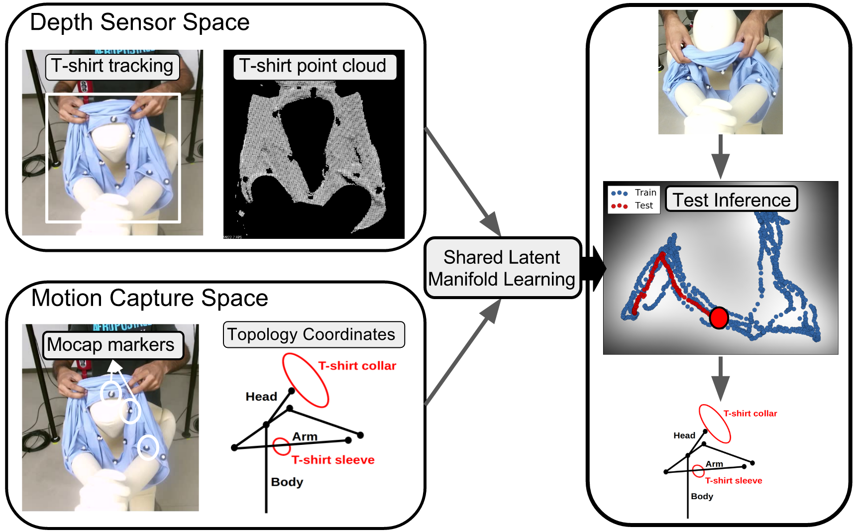 Robotic solutions to clothing assistance can significantly improve the quality-of-life for the elderly and disabled. Real-time estimation of human-cloth relationship is crucial for efficient learning of motor skills for robotic clothing assistance. The major challenge involved is cloth state estimation due to inherent non-rigidity and occlusion. In this study, we present a novel framework for real-time estimation of cloth state using a low-cost depth sensor making it suitable for a feasible social implementation. The framework relies on the hypothesis that clothing articles are constrained to a low-dimensional latent manifold during clothing tasks. We propose the use of Manifold Relevance Determination (MRD) to learn an offline cloth model which can be used to perform informed cloth state estimation in real-time. The cloth model is trained using observations from motion capture system and depth sensor. MRD provides a principled probabilistic framework for inferring the accurate motion-capture state when only the noisy depth sensor feature state is available in real-time. The experimental results demonstrate that our framework is capable of learning consistent task-specific latent features using few data samples and has the ability to generalize to unseen environmental settings. We further present several factors that affect the predictive performance of the learned cloth state model.